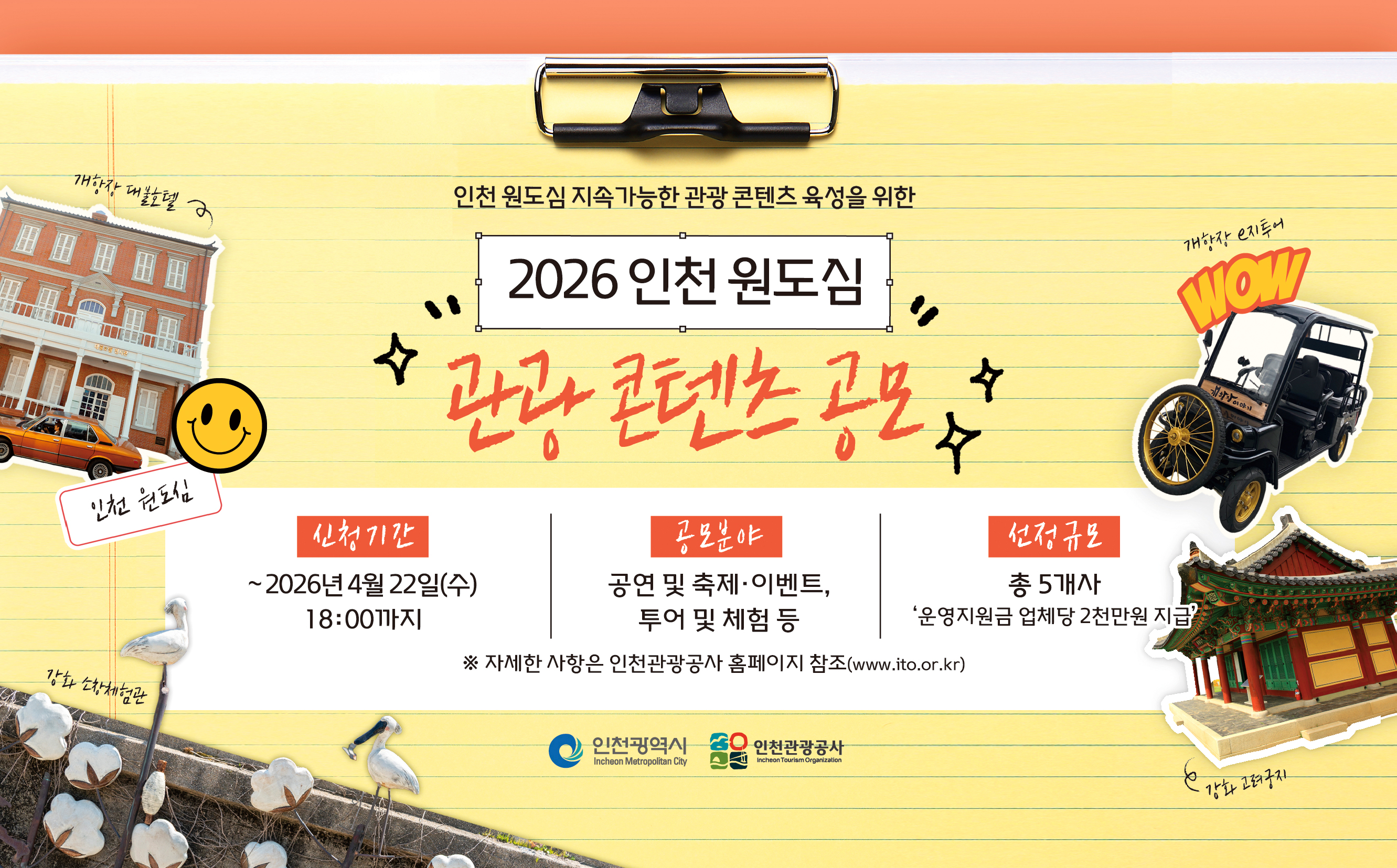 인천관광공사는 인천 원도심의 매력적인 관광 콘텐츠를 발굴하고 육성함으로써 지역경제를 활성화하고자 '2026 인천 원도심 관광 콘텐츠 공모 사업'을 추진합니다. 이는 인천 원도심의 역사, 문화, 자연 등 다양한 테마 자원을 활용한 체험형 관광 콘텐츠를 개발하고 운영하는 것을 목표로 합니다.